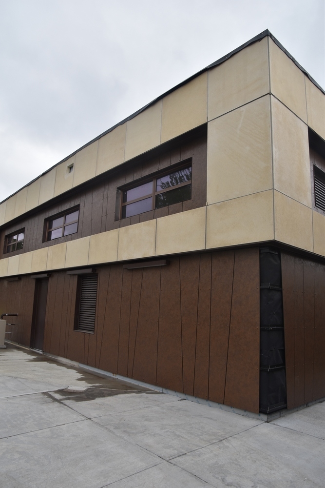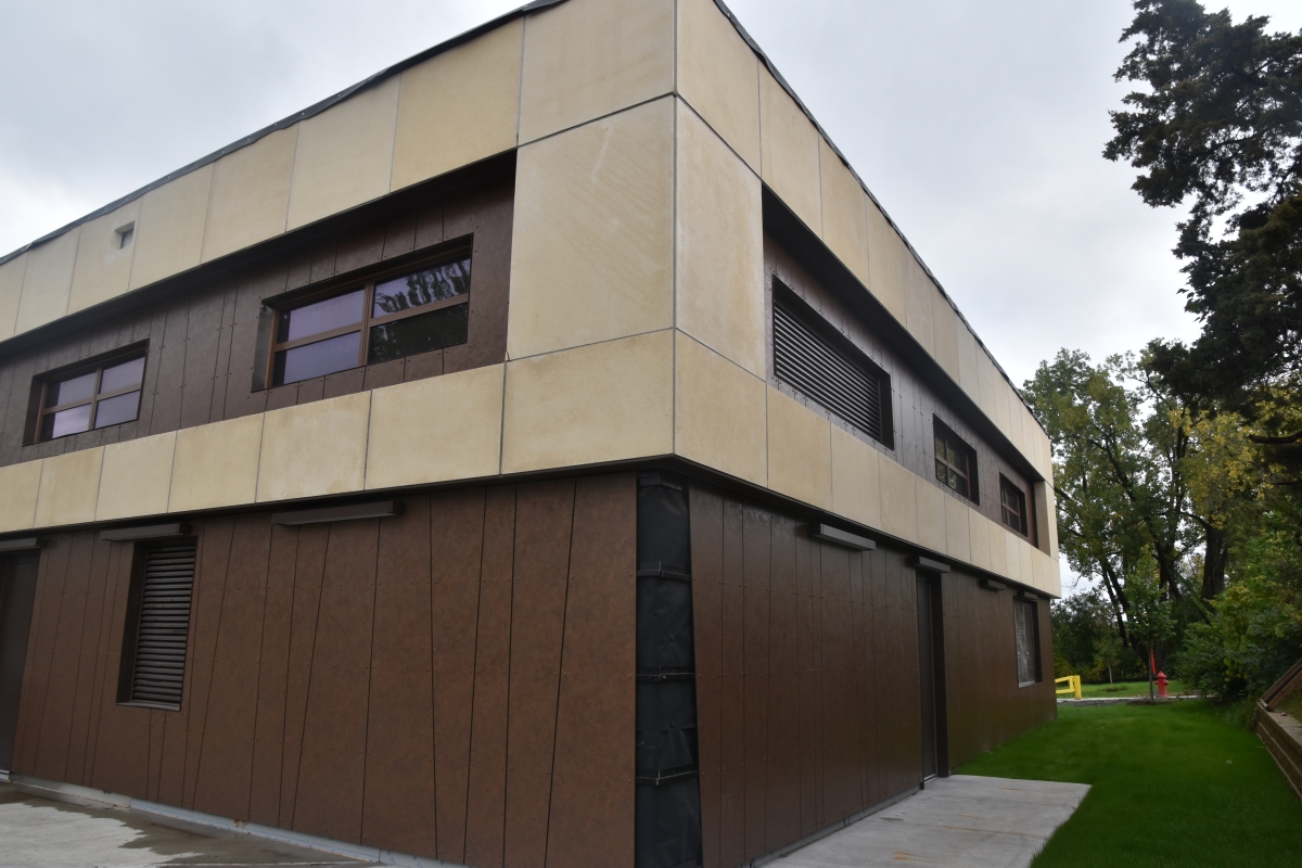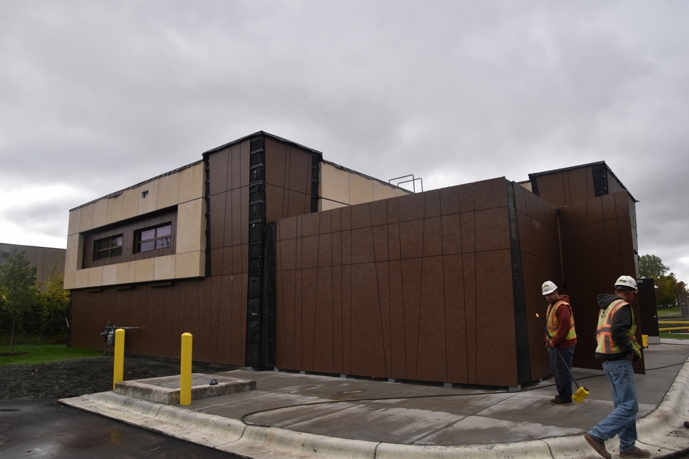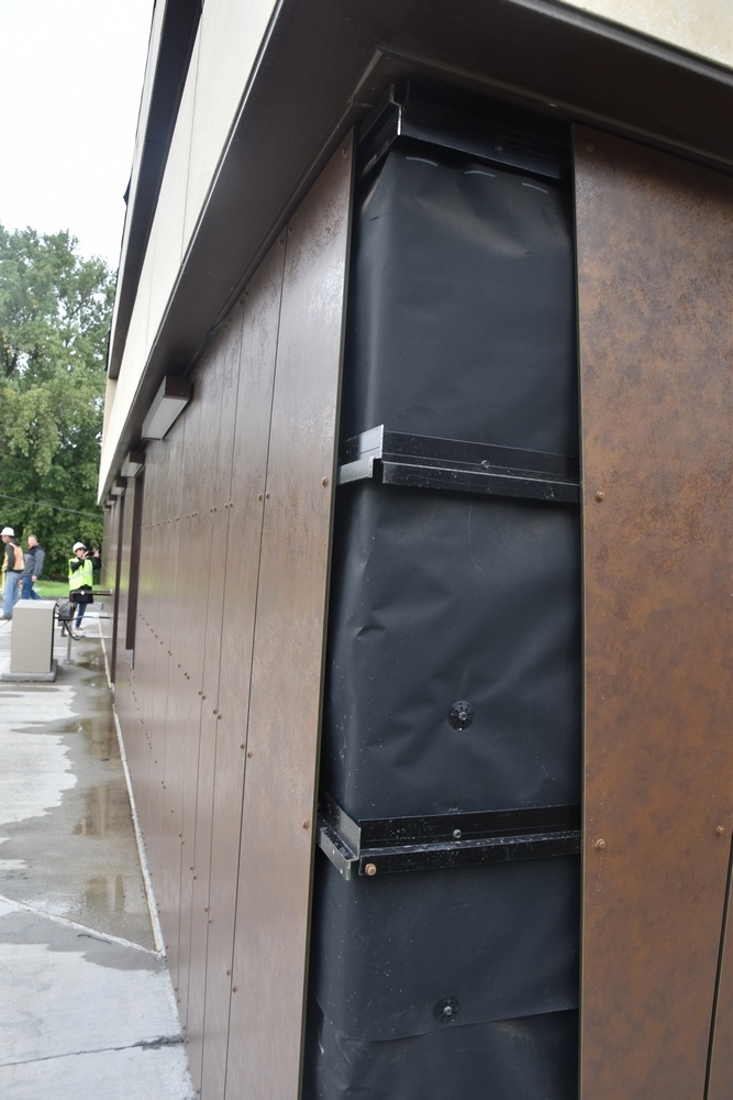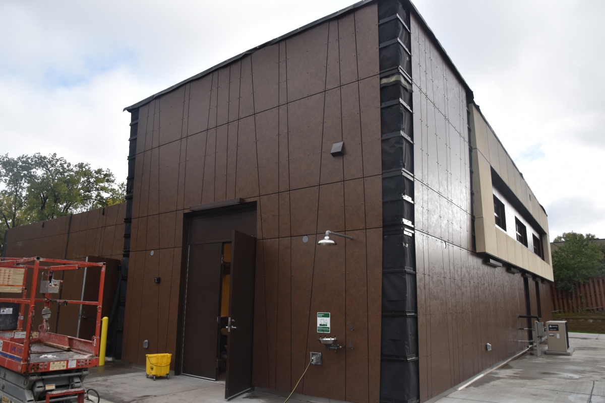 Hopkins Lift Station features Trespa Meteon Naturals in Hardened Brown, Thermafiber Rain Barrier 45 Mineral wool, and Vaproshield Revealshield IT Integrated Tape.